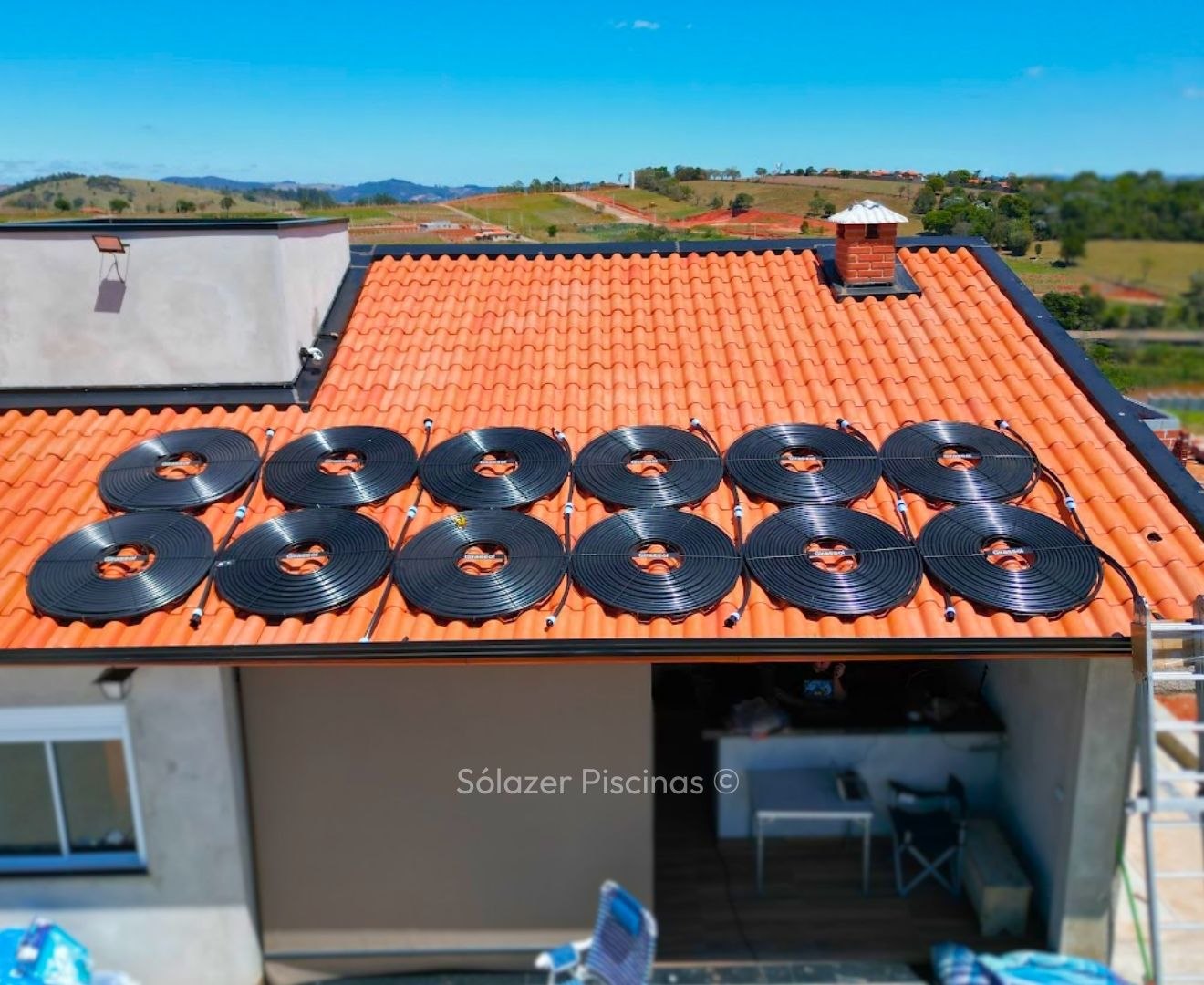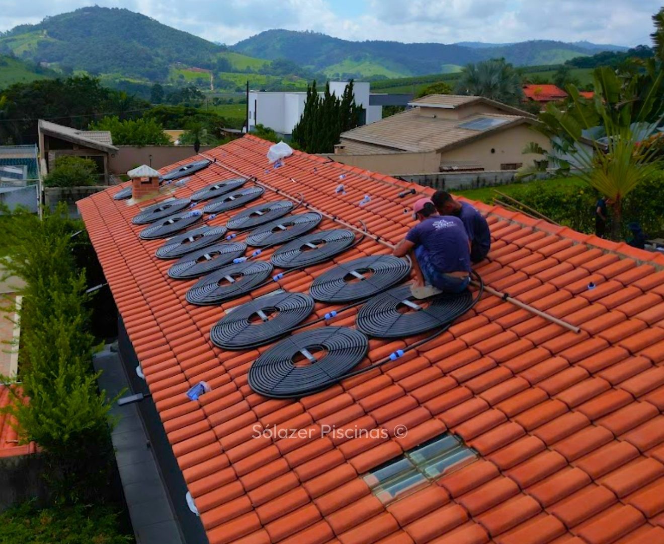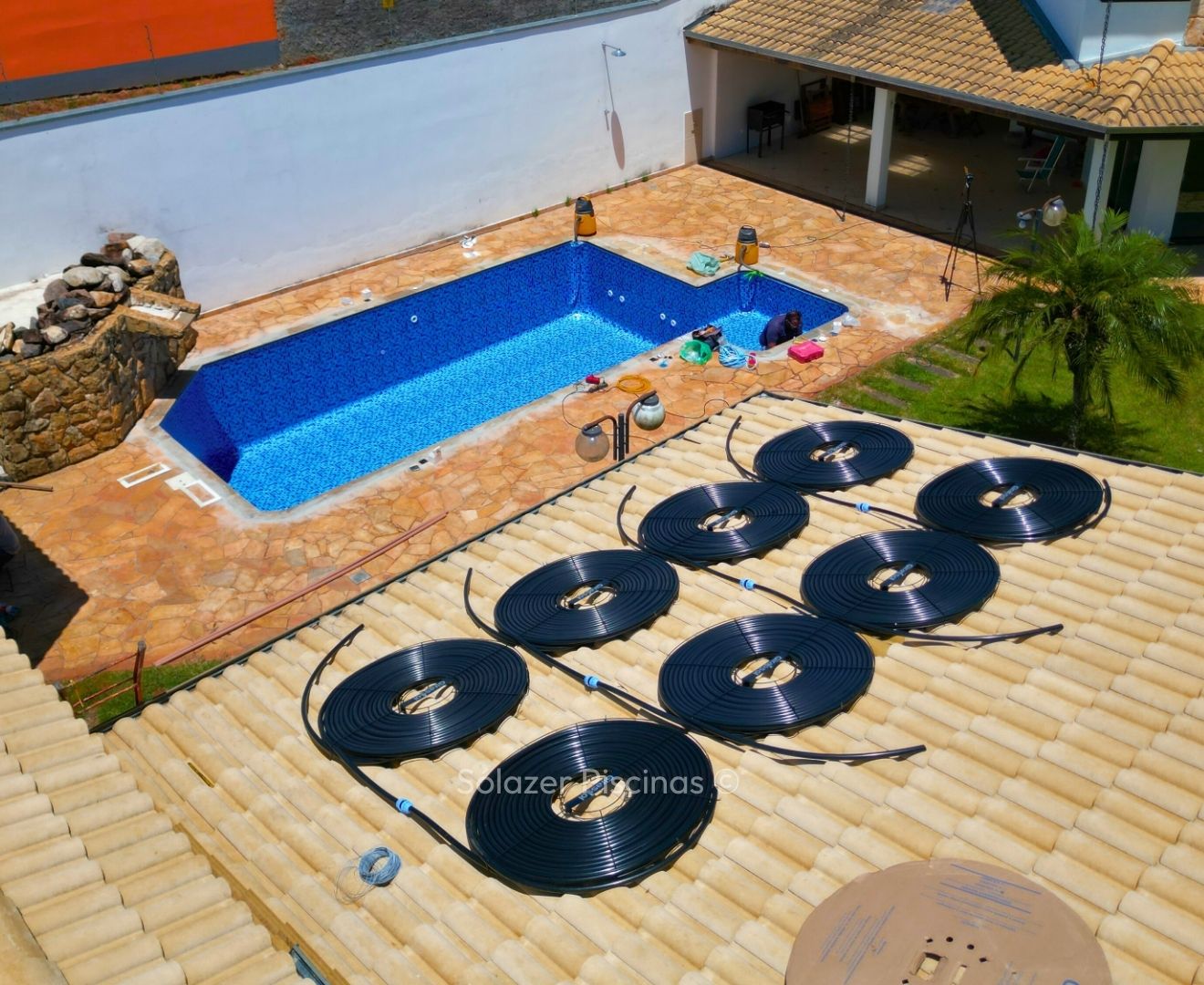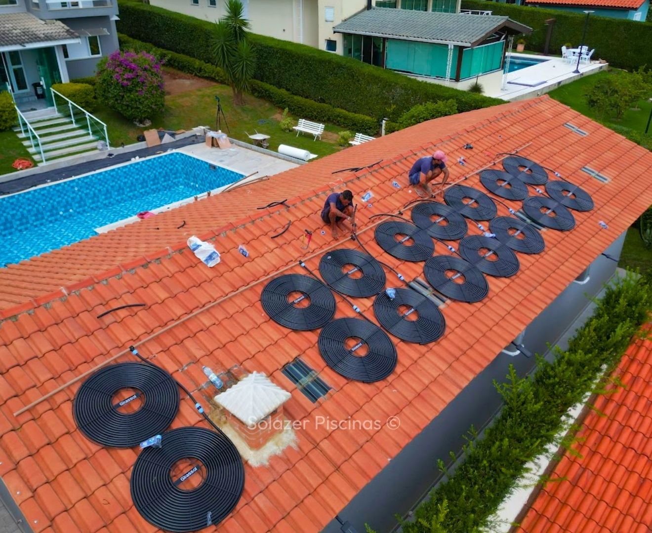 O aquecedor solar funciona com painéis instalados em telhados ou áreas com alta exposição solar, que captam o calor do sol e o transferem para a água da piscina por meio de tubulações, movidas por uma motobomba.