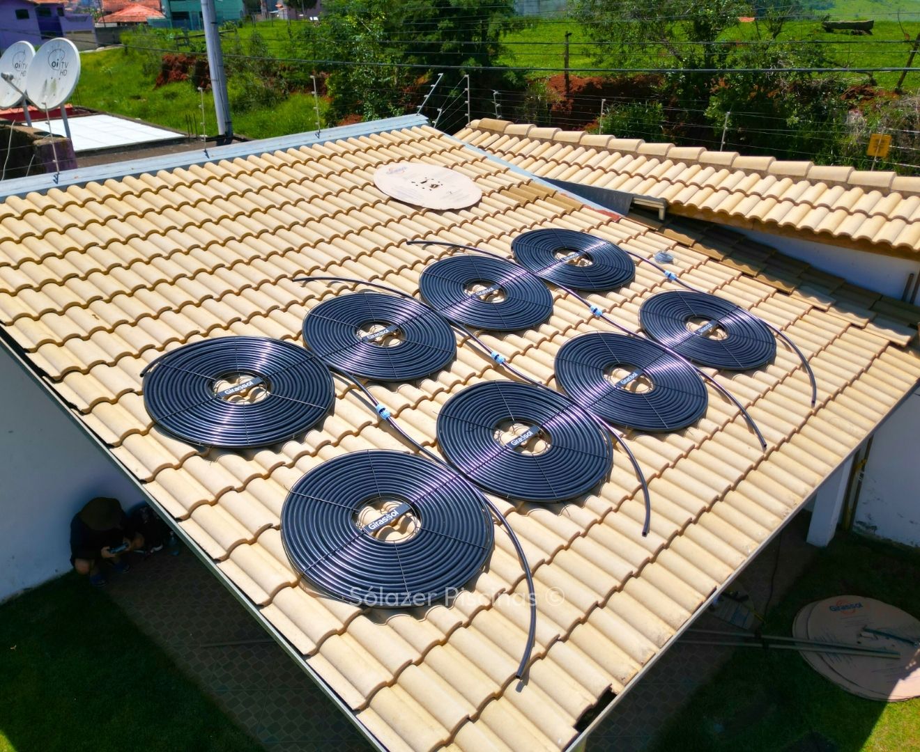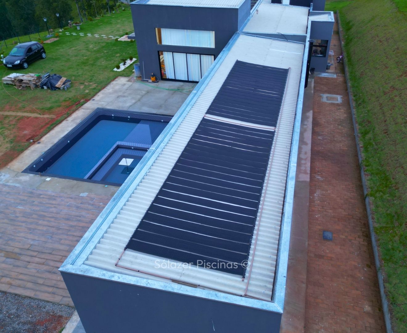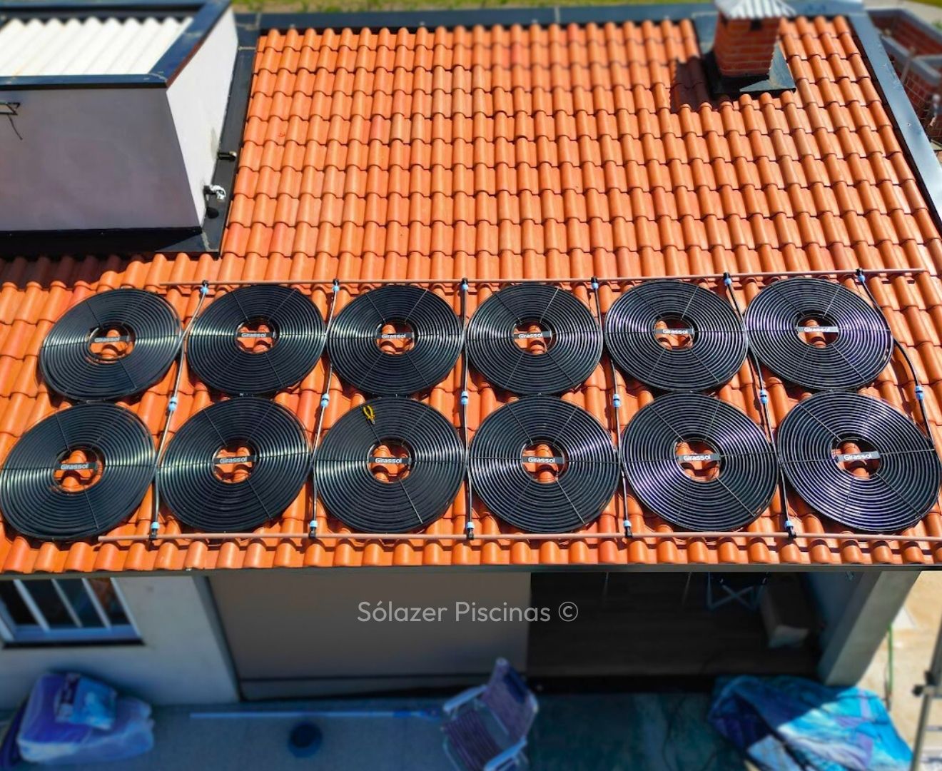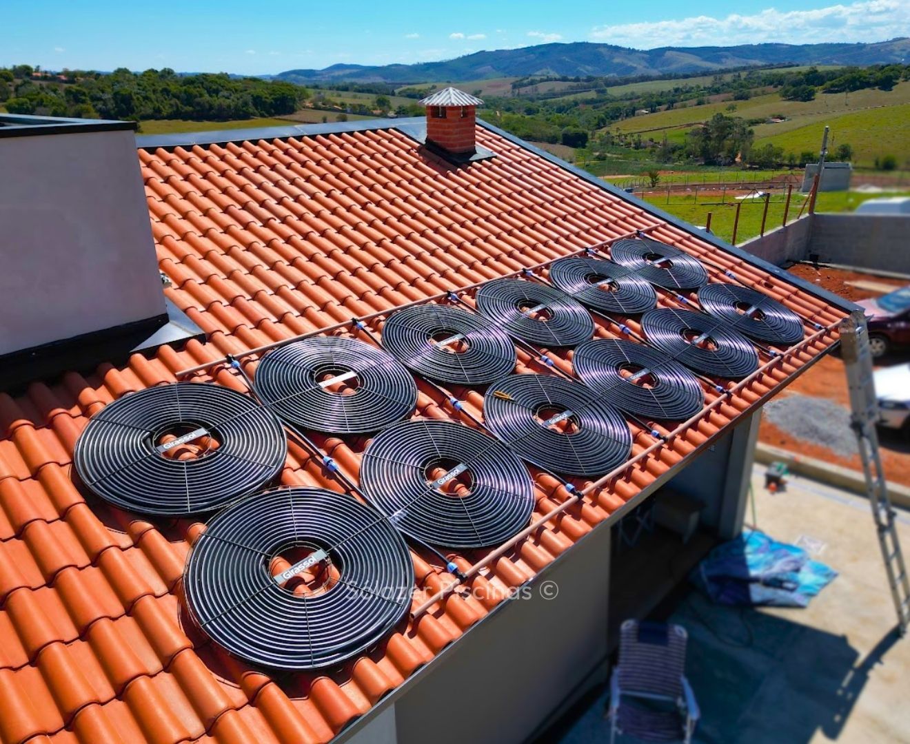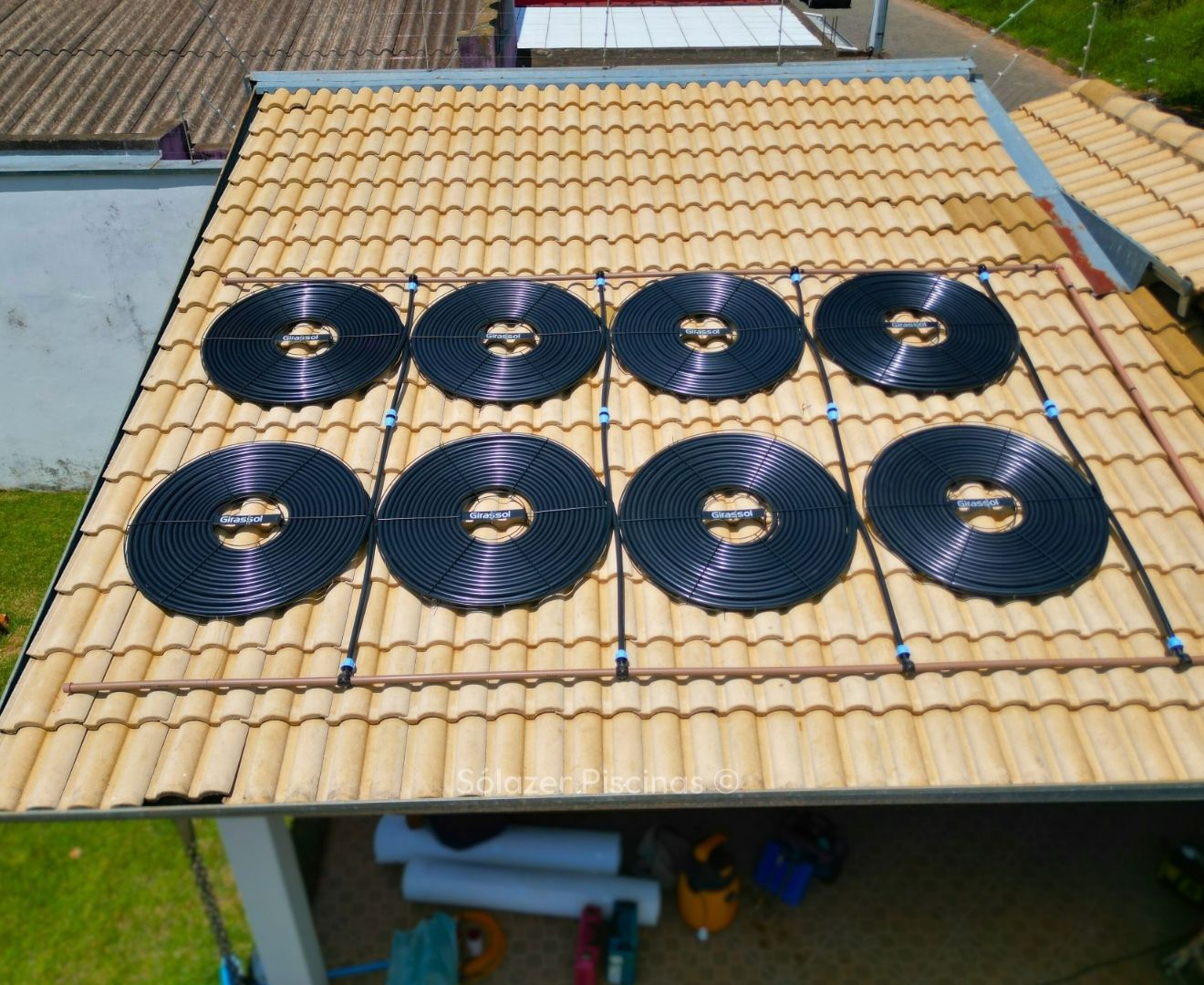 O aquecedor solar funciona com painéis instalados em telhados ou áreas com alta exposição solar, que captam o calor do sol e o transferem para a água da piscina por meio de tubulações, movidas por uma motobomba.
